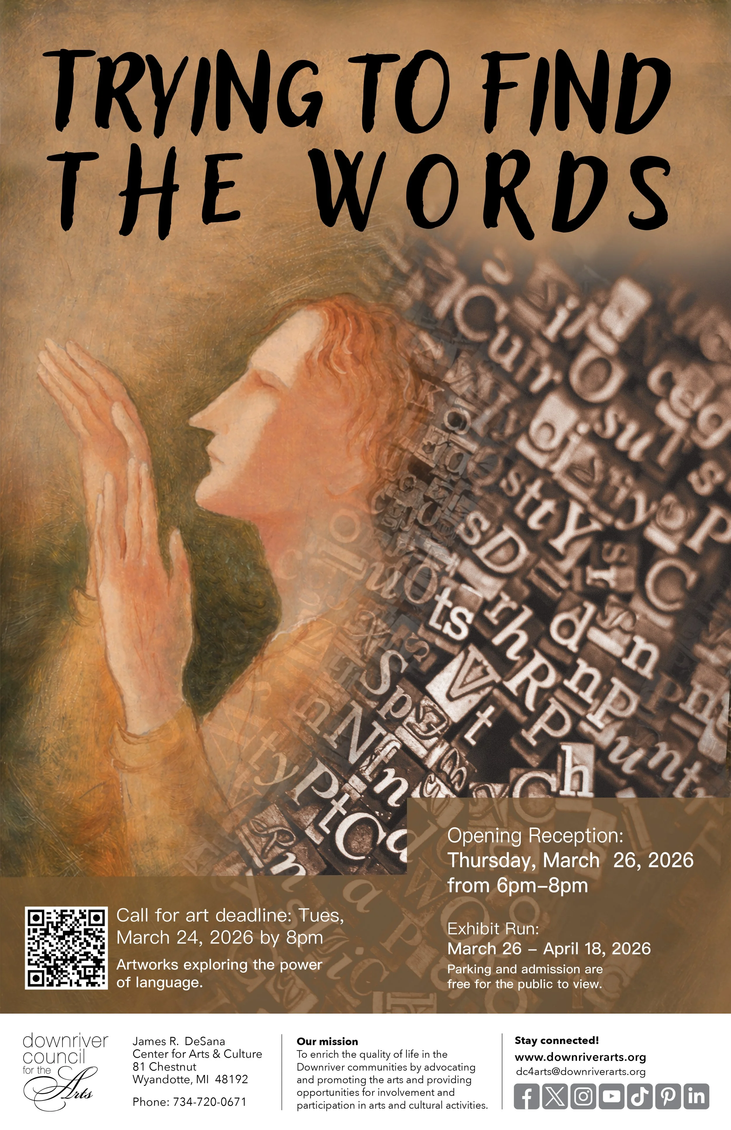 Along with regular visual and performance art entries into the exhibit, the DCA is also putting a call out for any visual artists who would like to submit a photo of their 2D, 3D or performance artwork being entered into the exhibit as a piece for a member of the Downriver Poets & Playwrights to add deeper emotional context and storytelling through creating a poetry piece inspired by the visual art. We are asking for these art submissions to be emailed by March 6, 2026 to dc4arts@downriverarts.org, subject: Ekphrastic entry.